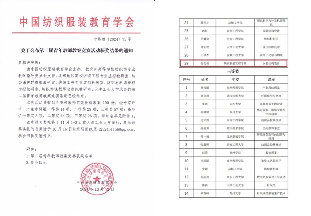 陕服新闻网讯(服装学院)为深入贯彻党的二十届三中全会精神,深入实施科教兴国战略、人才强国战略、创新驱动发展战略,落实立德树人根本任务,深化纺织类专业教学改革,中国纺织服装教育学会举办了“第二届青年教师讲课竞赛和教案竞赛”活动,服装学院岳文侠老师凭借精心的教学设计获得了本科组教师教案竞赛的二等奖,将于11月1日-3日还要去天津工业大学参加颁奖典礼和观摩学习。