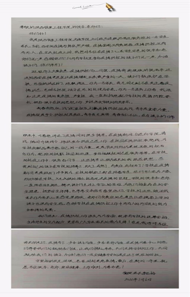 我是陕西服装工程学院交通学院 2021级高速铁路客运服务班的一名学生家长。当前,西安的疫情形势依然严峻,疫情面前没有旁观者,疫情防控没有局外人,在全民抗疫之时,我想对各位在疫情下仍心系学生安危的校领导和老师们说一声,感谢你们!向所有学校里参与疫情防控的孩子们说一声,加油孩子们,你们辛苦了!