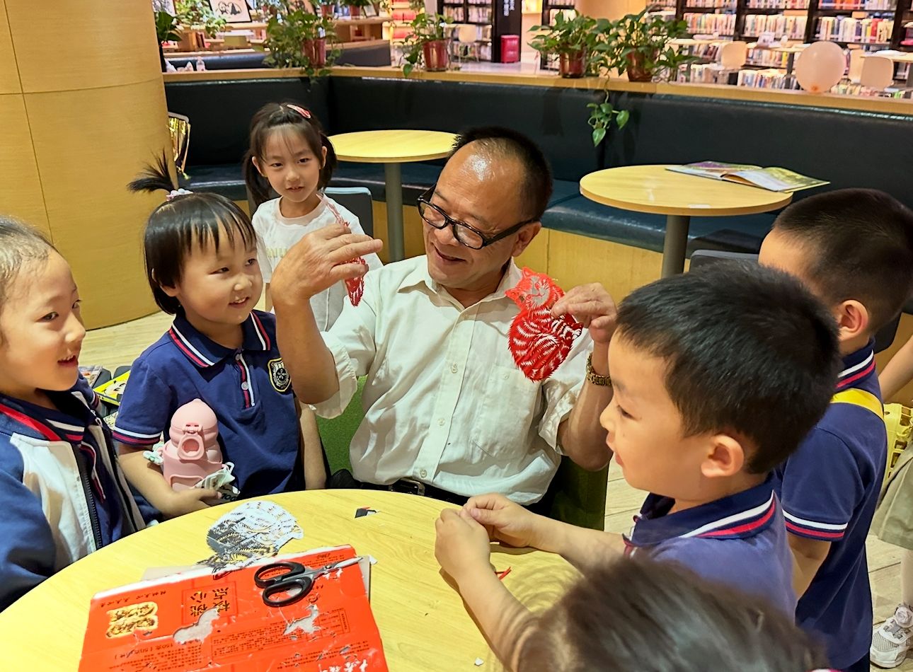 离开季羡林特藏室,孩子们来到文化体验区,开启了非遗剪纸艺术的体验之旅。图书馆邀请了我校艺术设计学院非遗剪纸传承人张润生老师,手把手教孩子们体验剪纸技艺。张老师手持彩纸和剪刀,一边耐心示范,一边讲解:“小剪刀,手中拿,轻轻转,慢慢剪,剪出漂亮的小雪花。”孩子们围坐在一起,目不转睛地看着张老师灵巧的双手将普通的彩纸变成栩栩如生的图案,发出阵阵惊叹。在实践环节,孩子们迫不及待地拿起剪刀和彩纸,在张老师和幼儿园带队老师的指导下,小心翼翼地裁剪起来。虽然动作略显稚嫩,但专注的神情格外动人。不一会儿,形态各异的剪纸作品诞生了:有的剪出了歪歪扭扭的小爱心,有的创作出造型独特的小动物,还有的剪出了绽放的花朵。孩子们高举着自己的作品,脸上洋溢着自豪的笑容,现场气氛热烈而温馨。