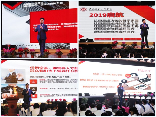 吕明结合自己的深刻感悟,以《学习习近平主席庆祝改革开放40周年讲话精神,凝聚新时代师生追赶超越创一流强大精神力量》为题,做成PPT,从世界巨变、中国巨变、陕服巨变、师生巨变等四个维度聚焦到“思想巨变”进行主题报告。他指出陕西服装工程学院25年办学实践充分证明,我们党开辟的中国特色社会道路、理论、制度、文化是完全正确的,形成的党的基本理论、基本路线、基本方略是完全正确的。我们学校的办学成绩同时也严格遵循《民办教育促进法》、《民办教育促进法实施条例》而取得的。学习习近平总书记讲话精神,就是要坚持我们“质量立校、人才强校、特色兴校、改革活校、依法治校”的治校五策,咬定青山不放松,按照我们迎接教育部本科教学合格评估制定的软硬件建设目标,进一步优化建设内容,提高投资效益,紧跟时代步伐,提升建设标准。习近平总书记关于改革开放是党和人民大踏步赶上时代的重要法宝,是坚持和发展中国特色社会主义的必由之路,是决定当代中国命运的关键一招,也是决定实现“两个一百年”奋斗目标、实现中国民族伟大复兴的关键一招的讲话,我们都要坚决拥护认同,目前学校正在集中精力迎评促建,学校董事会决定再增加3亿元,全部用于学校条件建设,重点投入教学信息化和智能化!我要用我毕生精力把民办教育事业办好,为伟大的改革开放添砖加瓦,增光添彩。董事长吕明的宣讲重点突出,PPT融画面视频为一体,形象生动,全场师生报以热烈的掌声。